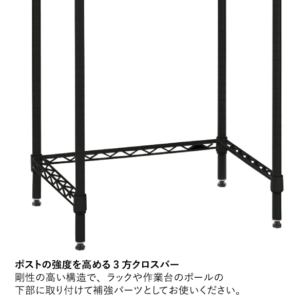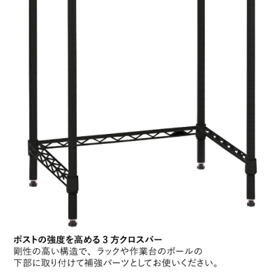 | 特徴 | ポストの強度を高める3方クロスバー。 剛性の高い構造で、ラックや作業台のポールの下部に取り付けて補強パーツとしてお使いください。 棚板を付けずに床上の空間を有効活用できます。また、シェルフ上部のこぼれ止めや棚間が空いている場合の中間補強としても使用できます。 |