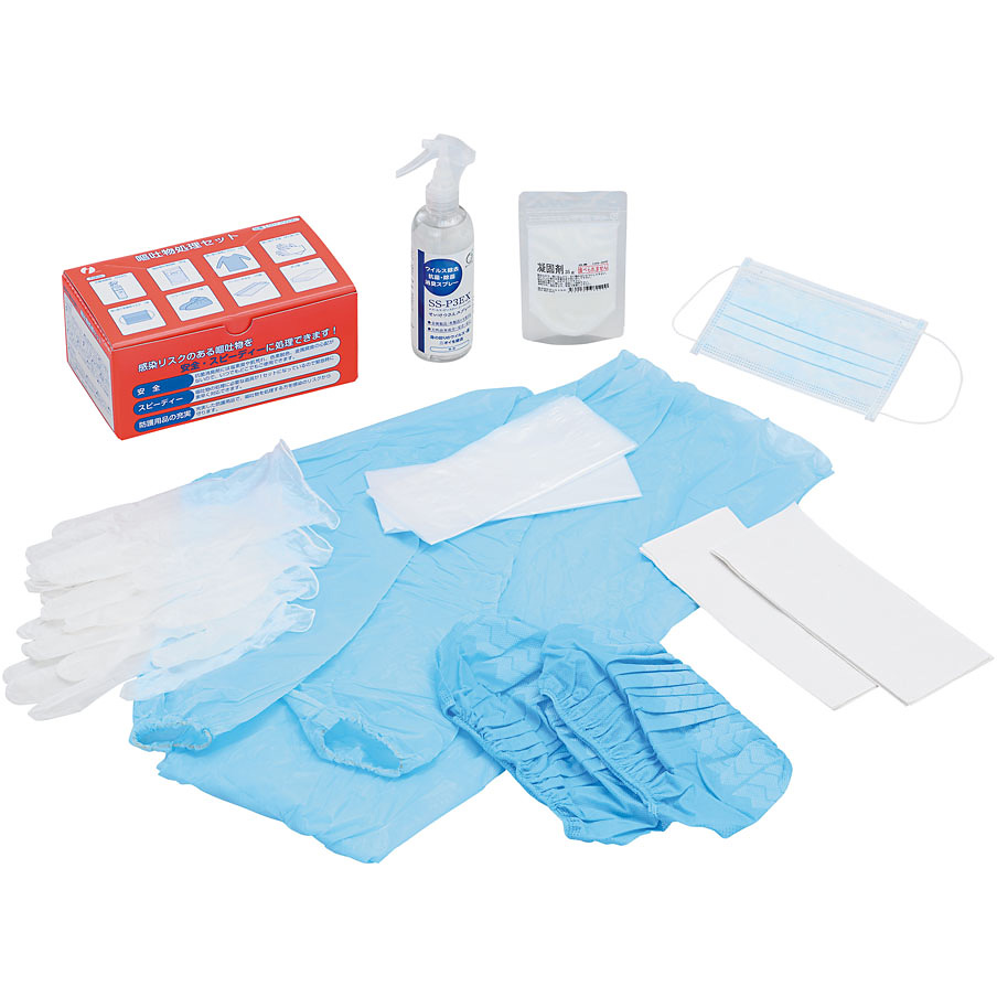 | セット内容 | 抗菌消臭剤(250ml)×1本、嘔吐物の凝固剤(35g)×1個、使い捨て長袖エプロン×1枚、使い捨て医療マスク×1枚、使い捨て手袋M・L×各1双、シューズカバー×1足、ペーパータオル×10枚、ポリ袋×2枚。 |